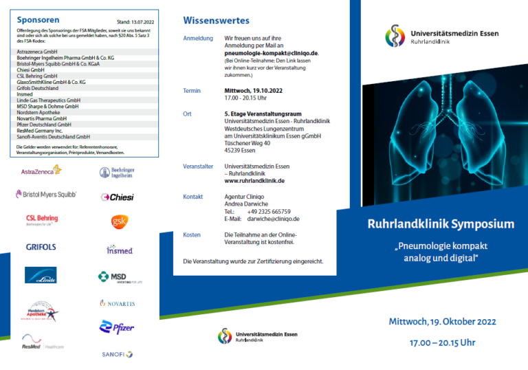 Diese Veranstaltung hat eine lange Tradition – so wie die Ruhrlandklinik selber, die in diesem Jahr ihren 120-jährigen Geburtstag feierte. Am 19. Oktober 2022 werden Herr Prof. Taube und sein Team über die brandneuen Entwicklungen in der Pneumologie informieren. Hier gehts zum Programm: